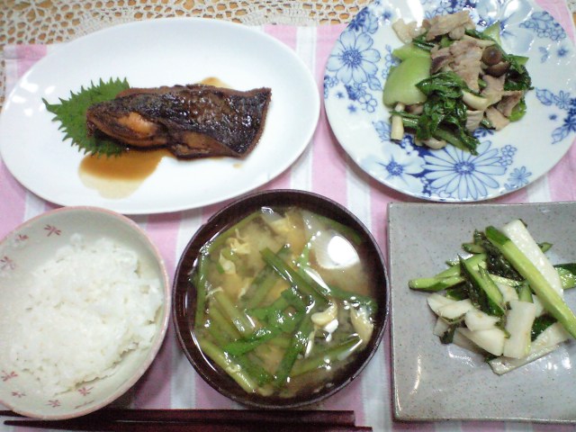 カレイの煮物、豚肉と小松菜としめみの炒め物(そのまんま)