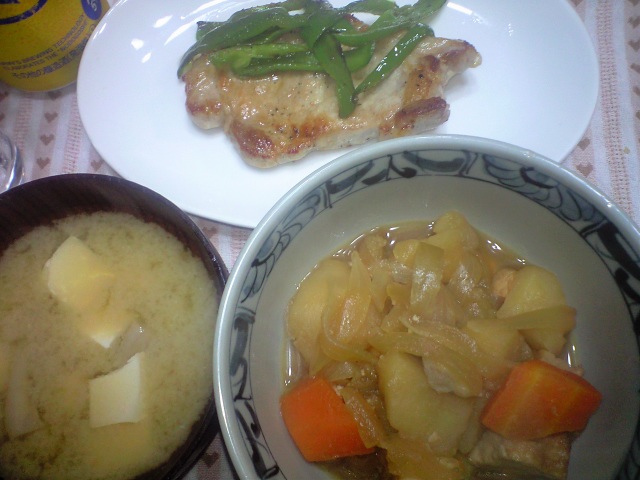 昨日の夕飯は、ポークソテーと肉じゃがと豆腐のお味噌汁でした。