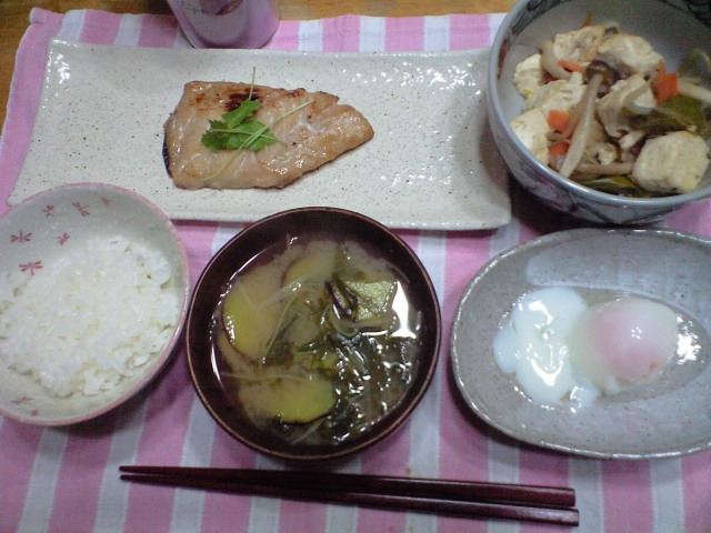 金目鯛の京粕漬け焼き、豆腐とわけぎの炒め物、味噌汁、温泉卵。