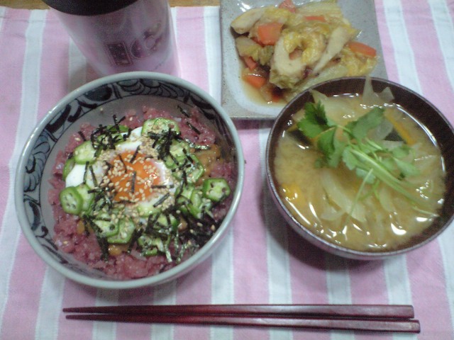 まぐろの混ぜ混ぜのっけ丼、焼ちくわと白菜のさっと煮、味噌汁。