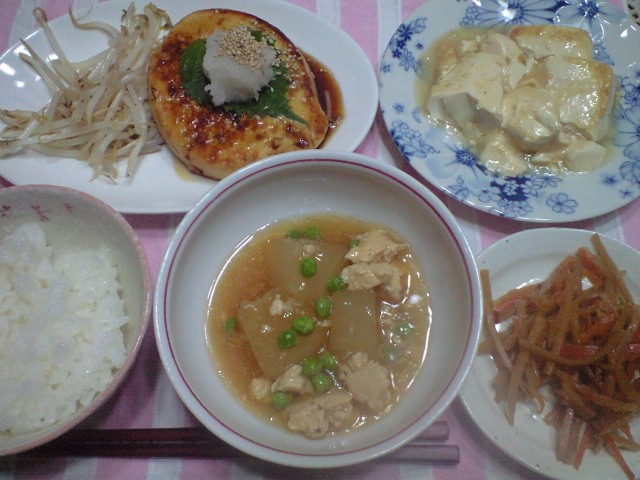 豆腐ハンバーグ、冬瓜のそぼろあんかけ、きんぴら、豆腐のあんかけ