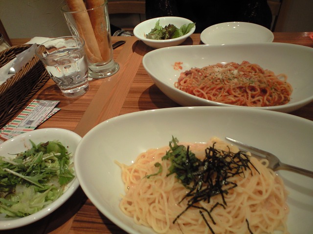 パスタは、トマトソースとタラコソースをシェアして食べました。