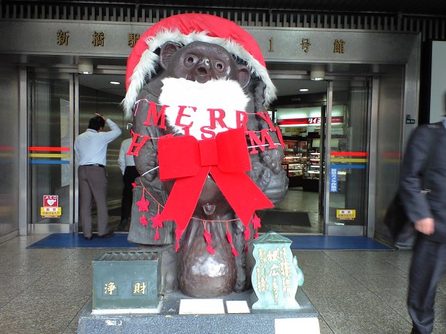 新橋のたぬきのお地蔵さんが、クリスマスバージョンになってました