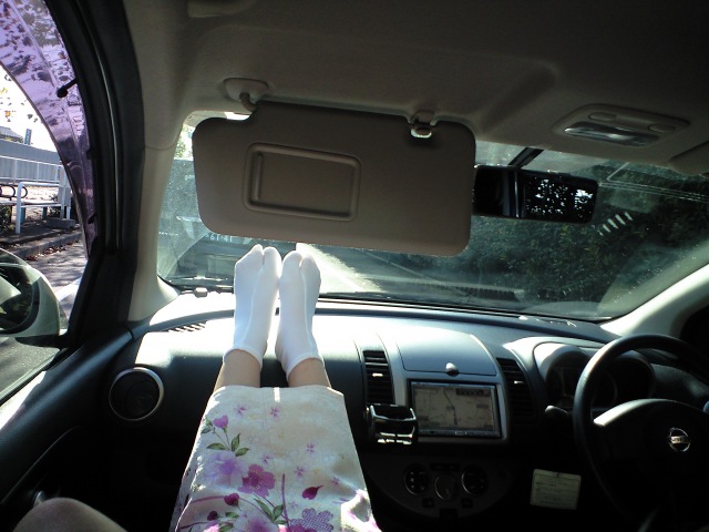 助手席に乗っていると、対向車の人が?って顔で着物姿の娘を見る。
