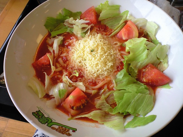 トマト味のスープにおうどんが入っていて、その上にチーズが乗っていて