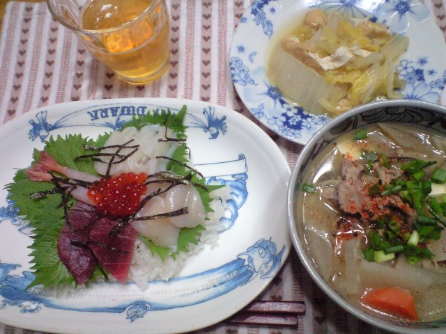 海の彩りちらし丼(まぐろの色悪し)、けんちん汁