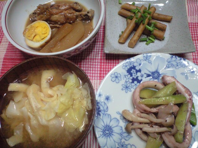 鶏手羽と大根の煮物、イカと野菜の塩炒め