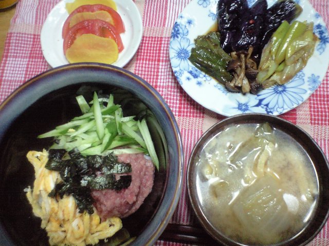 彩りすきみ丼、なすときのこの焼き浸し、白菜と油揚げのお味噌汁