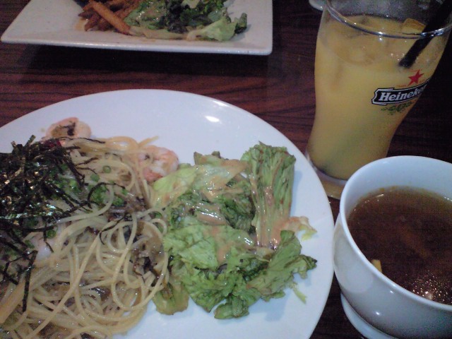 スープ、サラダ、パスタ、ドリングで900円。