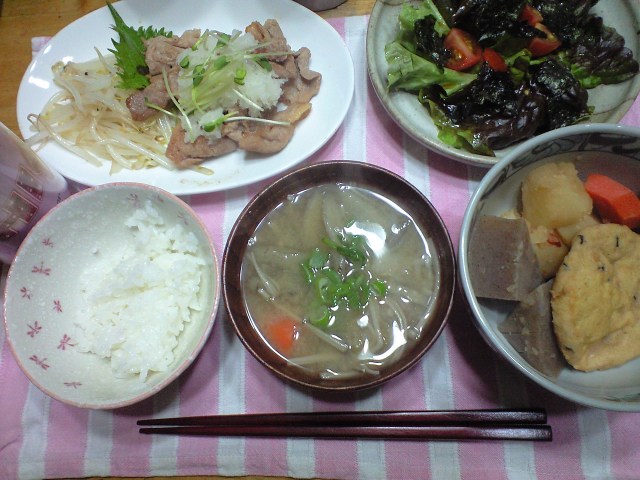 今日の夕飯は、牛丼、ほうれん草といり卵のごまドレッシング