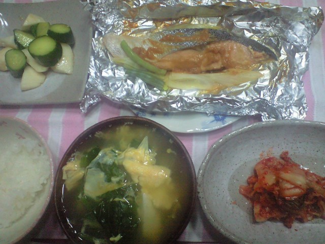 ますの葱みそ包み焼き、たたき芋、かき玉汁、牛角キムチ。