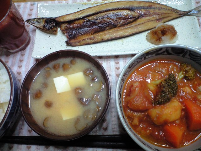 さんまの開き、鶏肉のトマト煮、豆腐となめこのお味噌汁でした