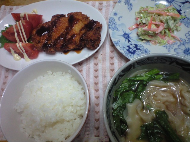 トンカツ、コールスローサラダ、ワンタンスープ。