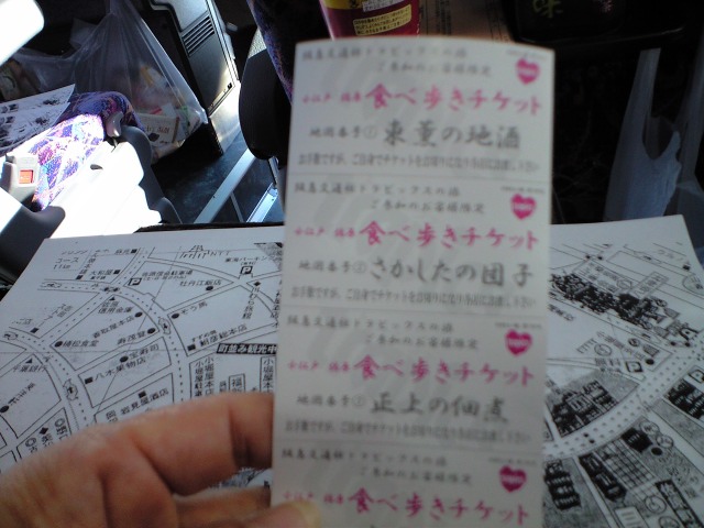 バスに乗り込むと無料の食べ歩きチケットを貰いました