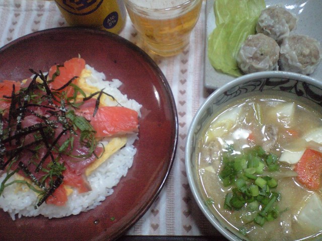 夕飯は、ちらし寿司、トン汁、しうまい。