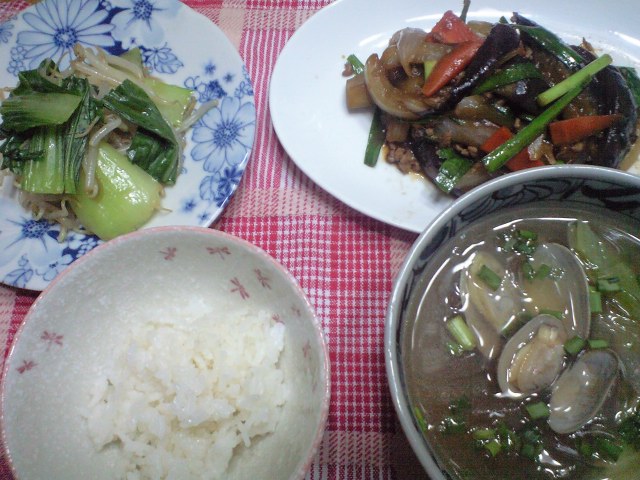 麻婆なす、あさりと春雨のスープ、青梗菜のナムル