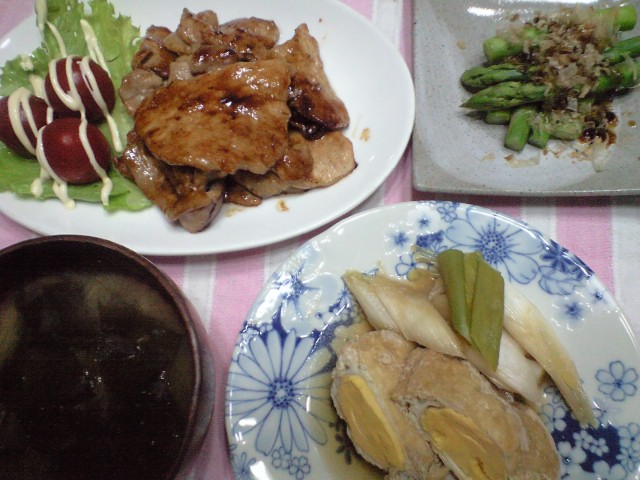 生姜焼き、アスパラのお浸し、油揚げの卵詰め煮