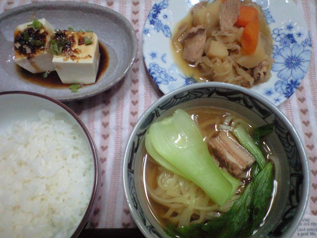の沖縄そばをスープ代わりに、肉じゃが、冷奴、沖縄そば。今日の夕飯は