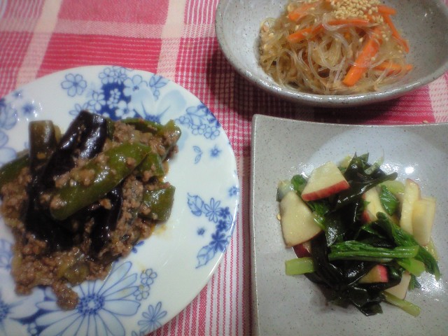 麻婆茄子、にんじんと春雨のシーチキン煮、わかめとリンゴのサラダ。