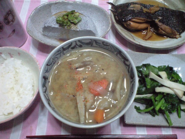 今日の夕飯は、かれいの煮付け、ほうれん草とエリンギの炒め物