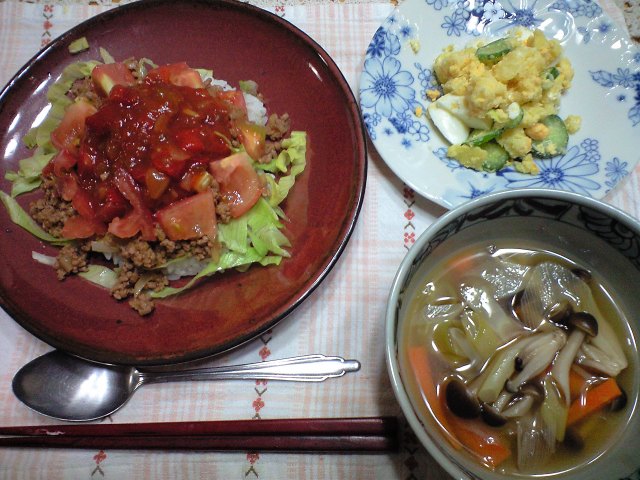 タコライス、ポテトサラダ、野菜スープ。