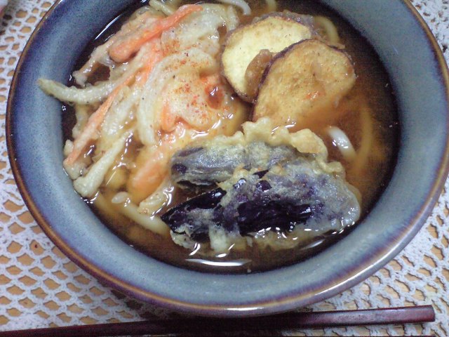 、さつまいも、たまねぎとにんじんの掻き揚げを作って、天ぷらうどんにしました。
