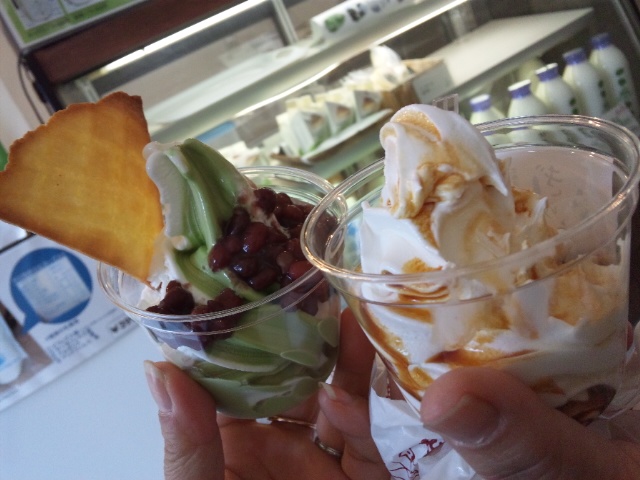 抹茶お小豆さんソフトと、キャラメルソフト、共に350円を食す。