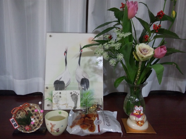 お花と御供物をお供えして