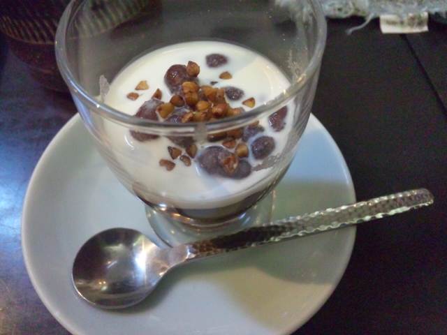 小豆に生クリームと蕎麦の実が乗ってます。