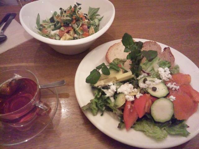 アボガドとサーモンのサラダにパンがセットになったもの。