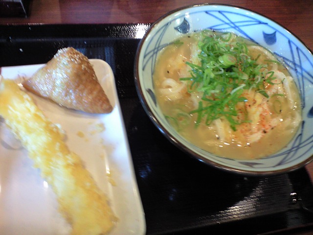 旦那さんは、釜玉うどんにいか天とわさびいなりをチョイス。