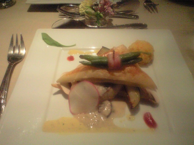 メインのお魚は真鯛で、茄子やパイや、いんげんのベーコン巻きで