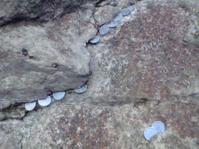 何故か崖のあちこちに1円玉が挟まってます。