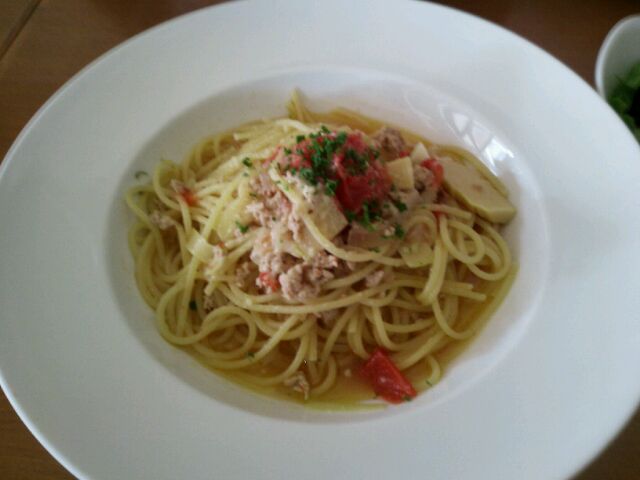 筍と鶏挽肉のパスタ。