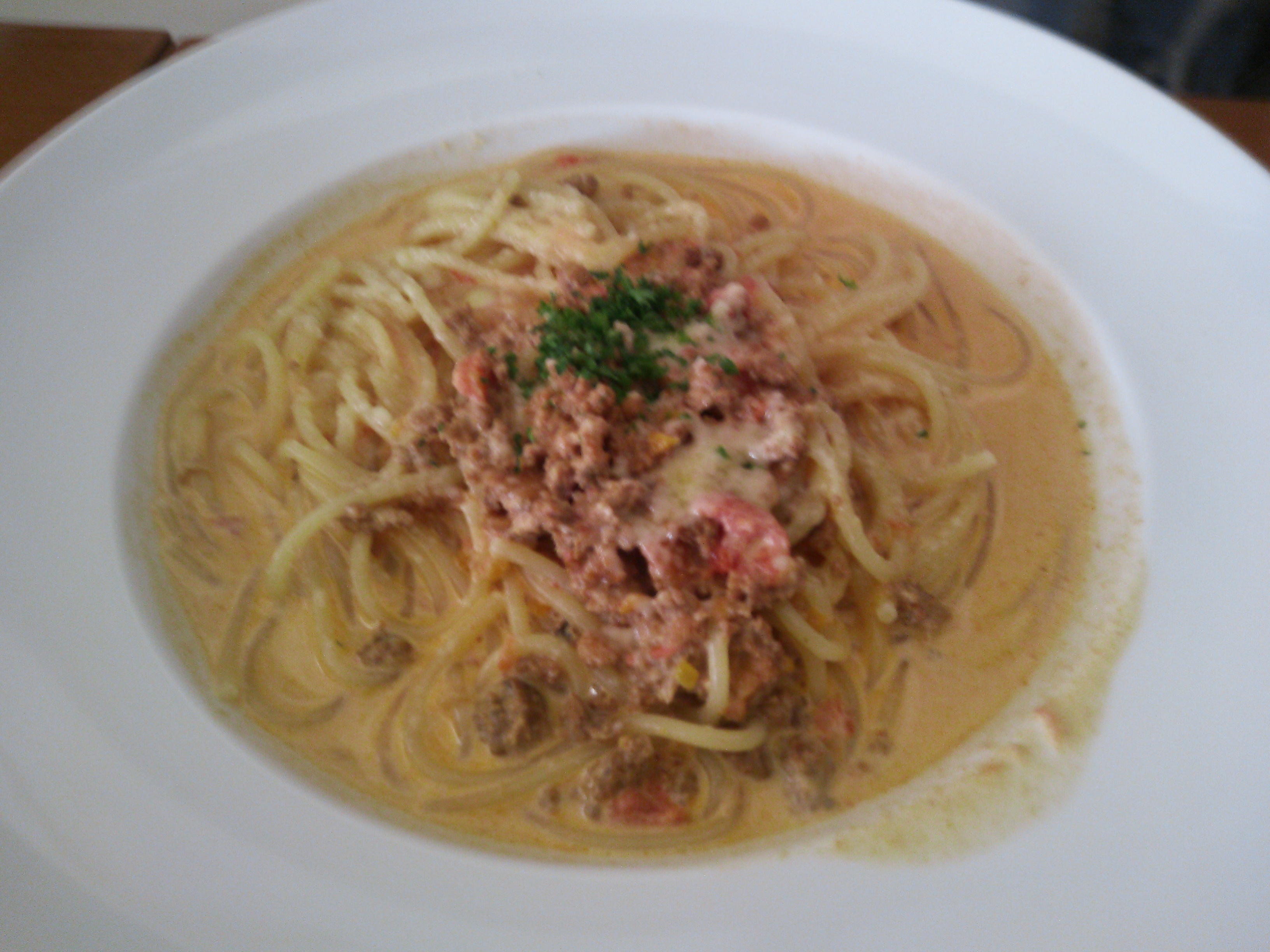 姉が食べた魚介ミートパスタ。
